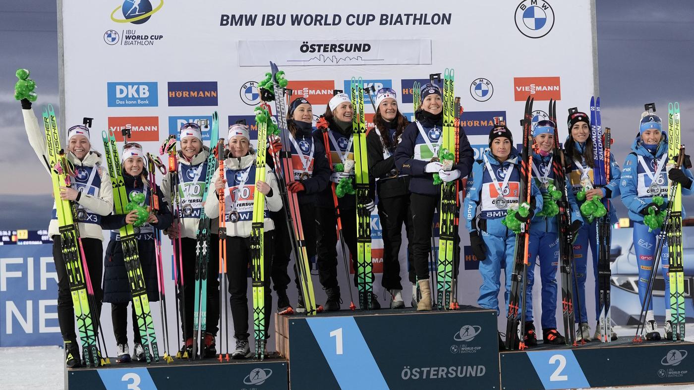1. Francie (Richardová, Michelonová, Braisazová-Bouchetová, Jeanmonnotová) 1:11:17,9 (0 tr. okruhů + 8 dobíjení), 2. Itálie (Wiererová, Carraraová, Vittozziová, Auchentallerová) -13,8 (1+9), 3. Česko (Jislová, Charvátová, Voborníková, Davidová) -30,8 (0+8), 4. Švédsko -45,5 (2+10), 5. Rakousko -1:31,8 (1+12), 6. Finsko -2:09,2 (1+9).