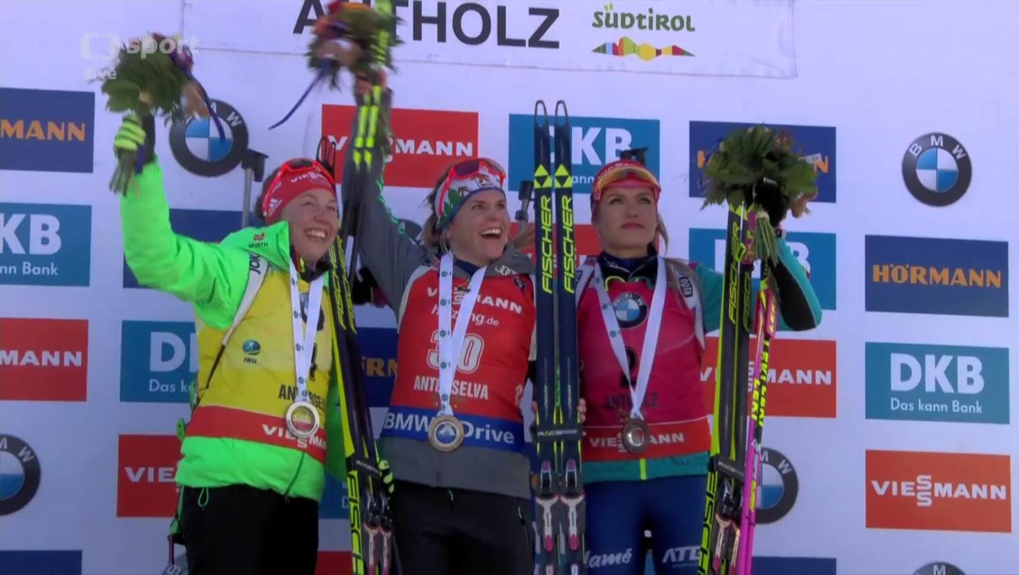 Medailový ceremoniál po hromadném závodu žen v Anterselvě