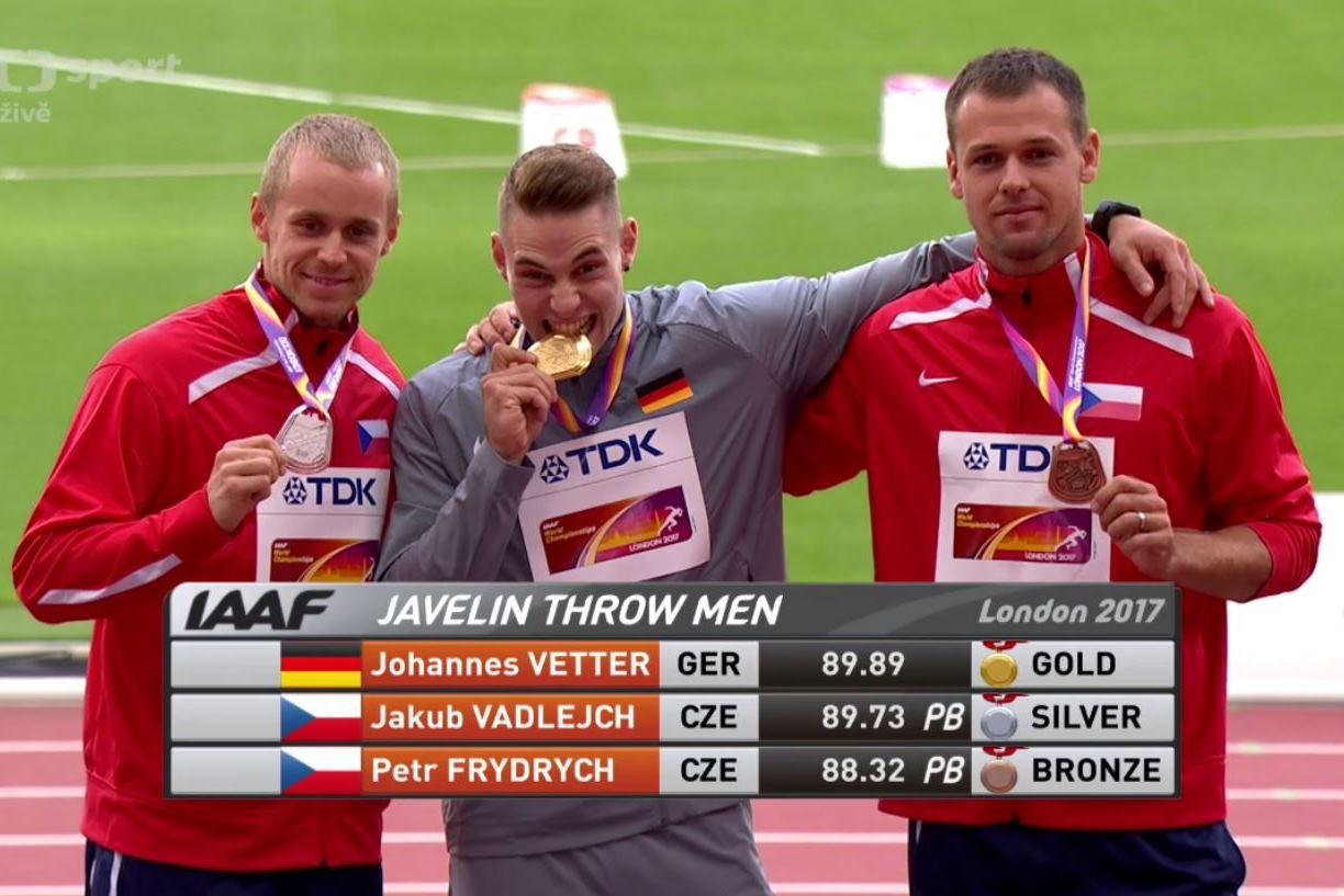 Medailový ceremoniál oštěpařů za účasti Vadlejcha s Frydrychem