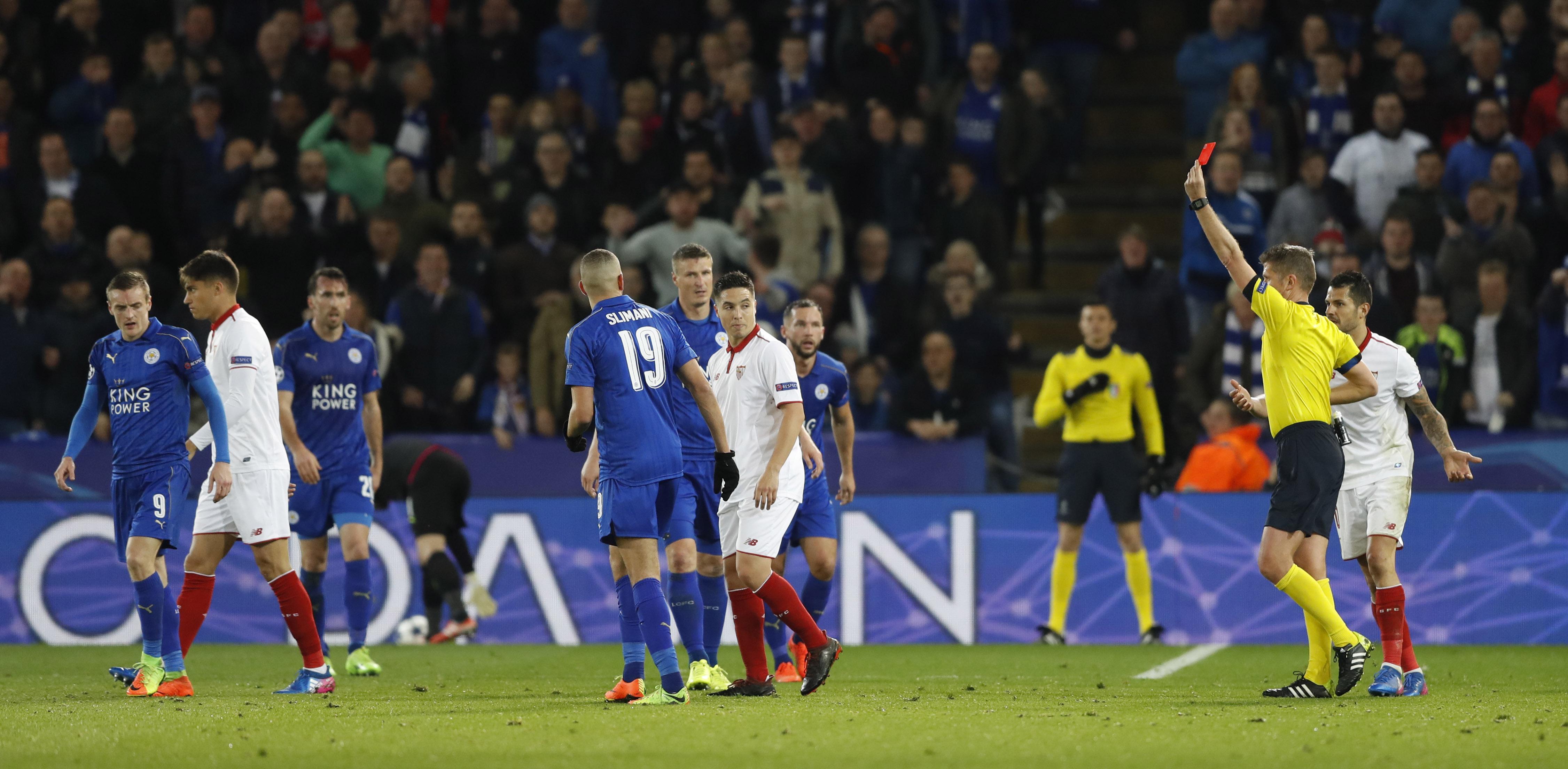 Moment utkání Leicester - Sevilla: Vyloučení Nasriho (74. min.)